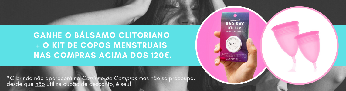 Nas compras acima dos 120€ - sem a utilização de cupão de desconto- você ganha o BÁLSAMO CLITORIANO + o KIT DE COPOS MENSTRUAIS!