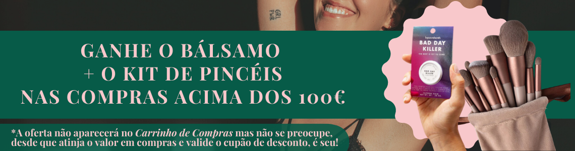 Nas compras acima dos 100€ você ganha o BÁLSAMO CLITORIANO + o KIT DE PINCÉIS DE MAQUIAGEM com o cupão: DIADAMULHER (ESGOTADO)