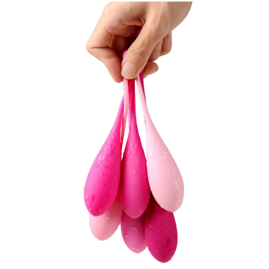 Kit de cones para treinamento do assoalho pélvico. Totalmente em silicone de grau médico proporcionando conforto e facilitando a higiene. Contém 6 pesos para evolução do fortalecimento muscular. Pesagem inicial de 50g e máxima 130g.