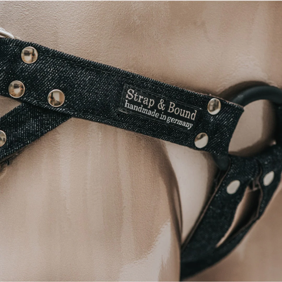 O Strap & Bound Harness é um arnês alemão feito à mão, em material macio e vegano, em tecido de ganga, proporcionando maior conforto para utilização e sendo fácil de limpar.